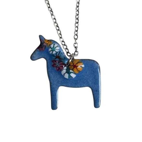 SCANDI DALA HORSE NECKLACE WITH FLOWER SADDLE, CORNFLOWER BLUE